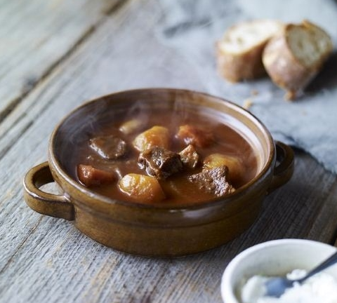 赤身の牛肉を赤ワインとデミグラスソースで煮込み、さらっとしたシチューに仕上げました。