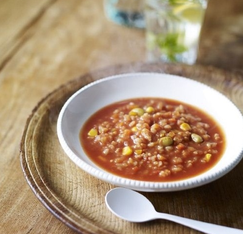 トマトの程よい酸味が効いたヘルシーなスープリゾットに仕上げました。
