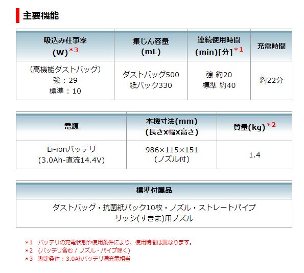 Li-ionバッテリ | 986×115×151 (ノズル付) | 1.4 |