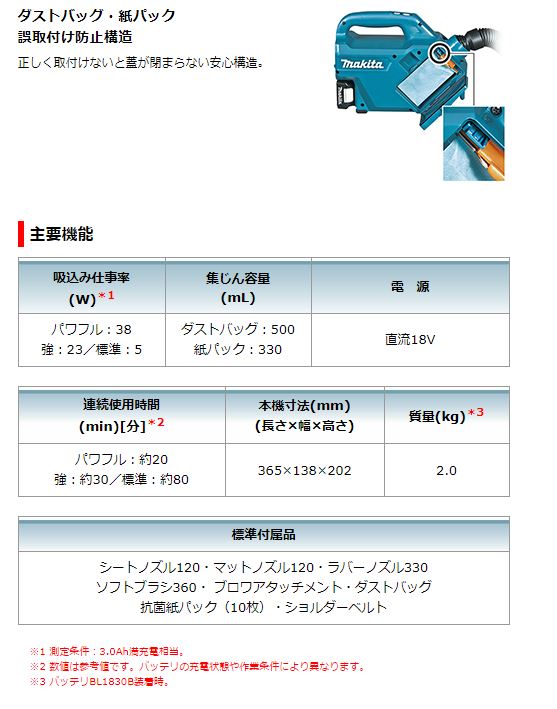 | パワフル:38 強:23/標準:5 | ダストバッグ:500 紙パック:330 | 直流18V |