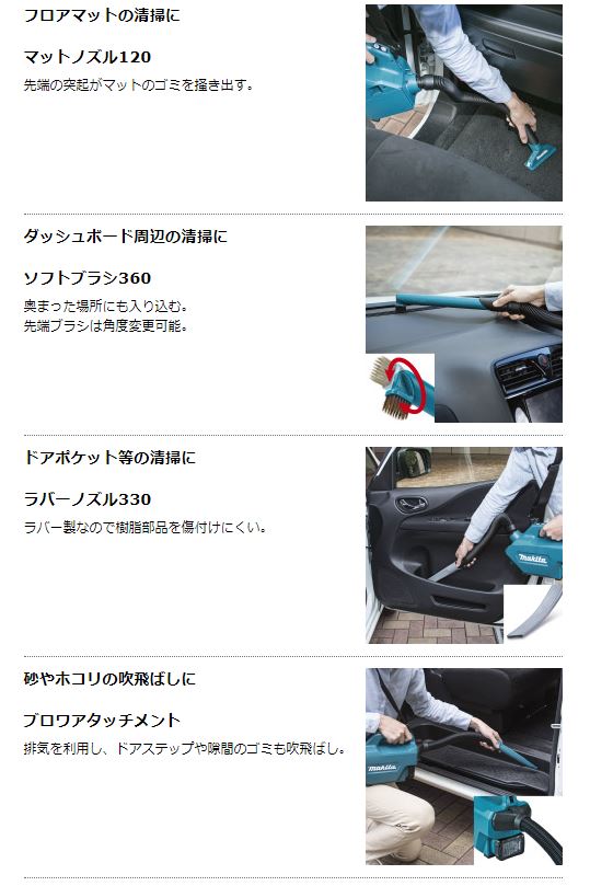 | 標準付属品 | シートノズル120・マットノズル120 ラバーノズル330・ソフトブラシ360 ブロワアタッチメント・ダストバッグ 抗菌紙パック(10枚)・ショルダーベルト |