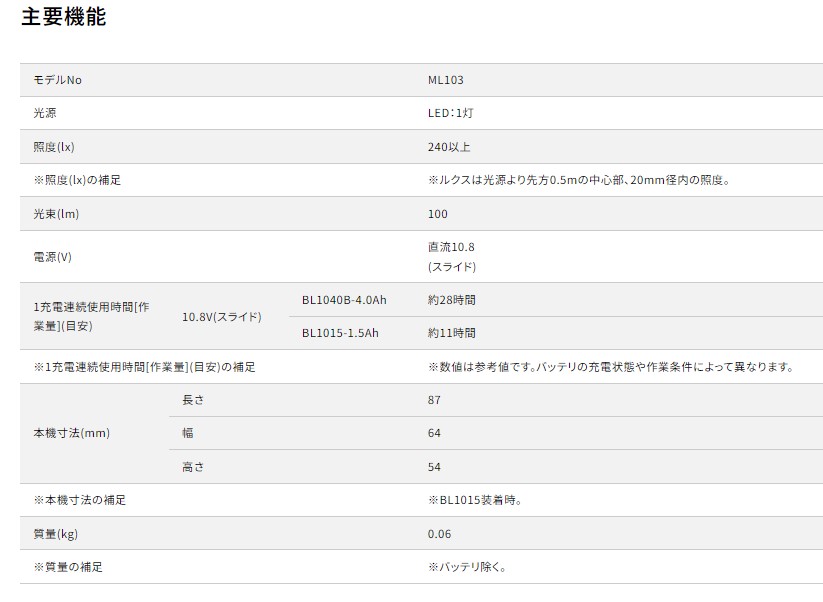 マキタ 10.8Vスライド式充電式LEDライト ML103バッテリ・充電器別売 [ML103]