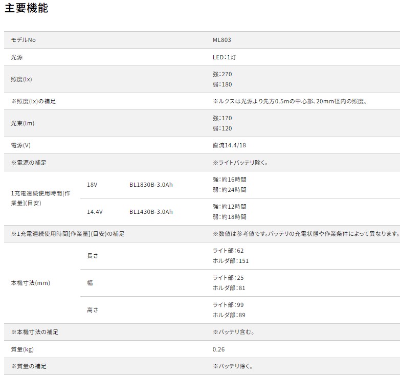 | 62×25×99 | 151×81×89 (BL1830取付時) | 1.3※2 (カール コード) | 0.26 (バッテリ 除く) |