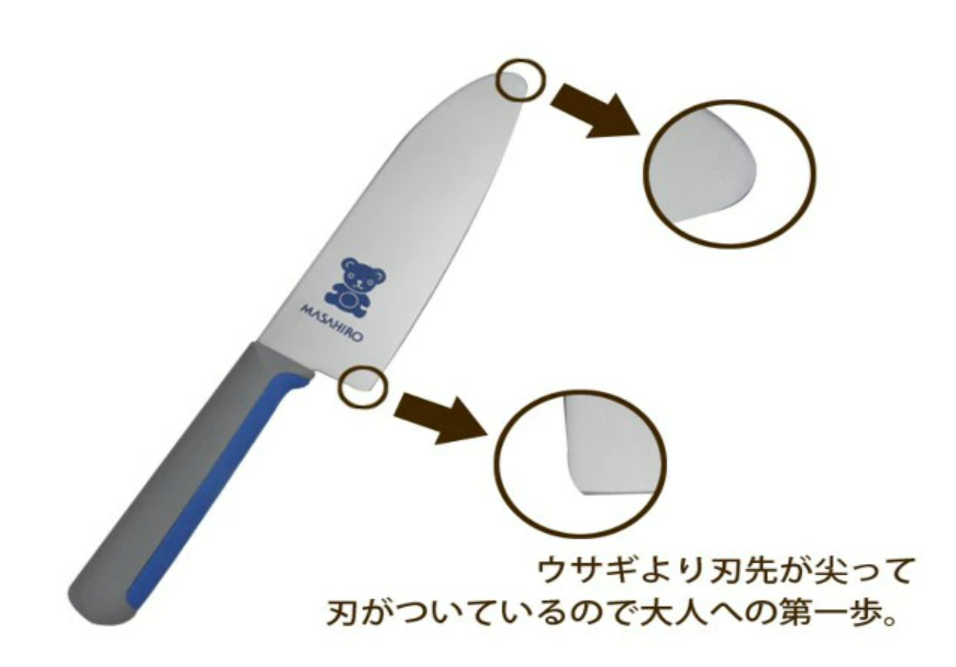 刃先、刃元のカットが丸いのでお子さまにも安心してお使いいただける子供包丁です。