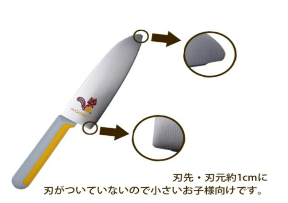 刃先、刃元のカットが丸いのでお子さまにも安心してお使いいただける子供包丁です。